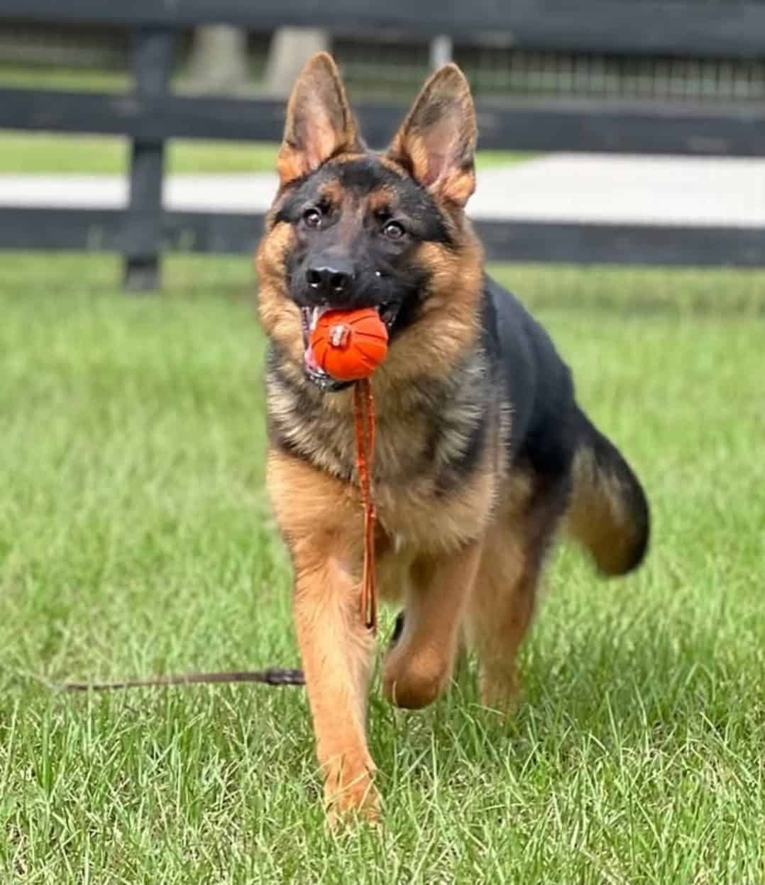 German Shepherd puppy carries ball during training session on grassy field, demonstrating obedience and agility.