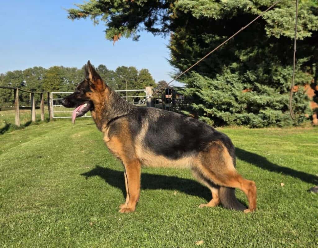 Zara is a sweet, affectionate female that we imported directly from Germany, and from the moment she arrived, she made quite an impression. Although she was initially selected for our breeding program, her temperament won us over immediately—steady, loving, and wonderfully connected to her people. She has quickly become both an exceptional show prospect and a cherished companion in our home