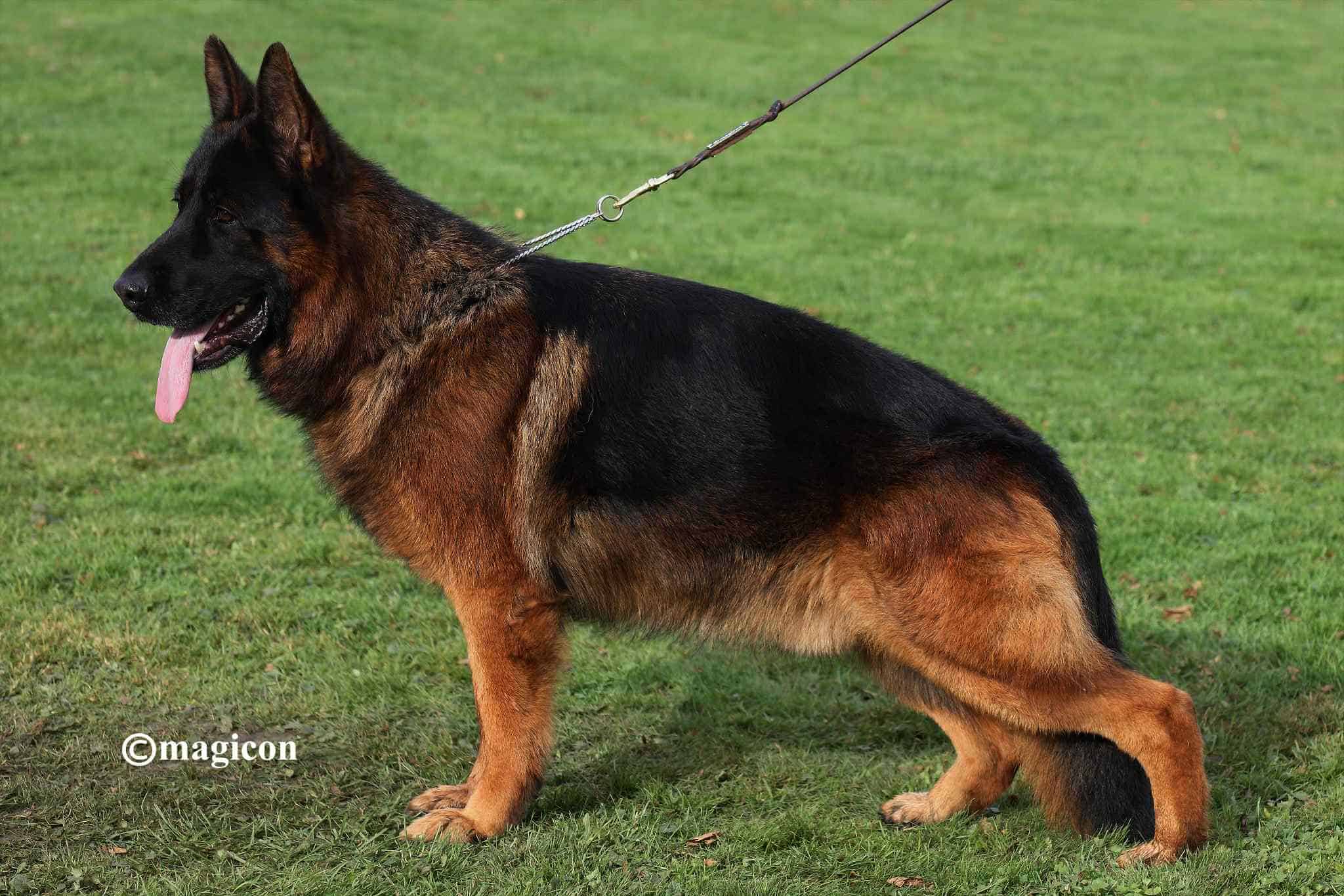 Medium-sized, medium-strong, substantial, elongated, strikingly expressive, very well-pigmented male with a well-shaped, strong head. Pronounced withers, firm back, very well-set croup. Good angulation of the forequarters, very good angulation of the hindquarters, straight front and gait. With excellent presentation, he displays dynamic movement with very good ground cover. Pronounced TSB (temperament, self-confidence, and courage). Excellent. Strikingly expressive male with very good conformation and very good movement.